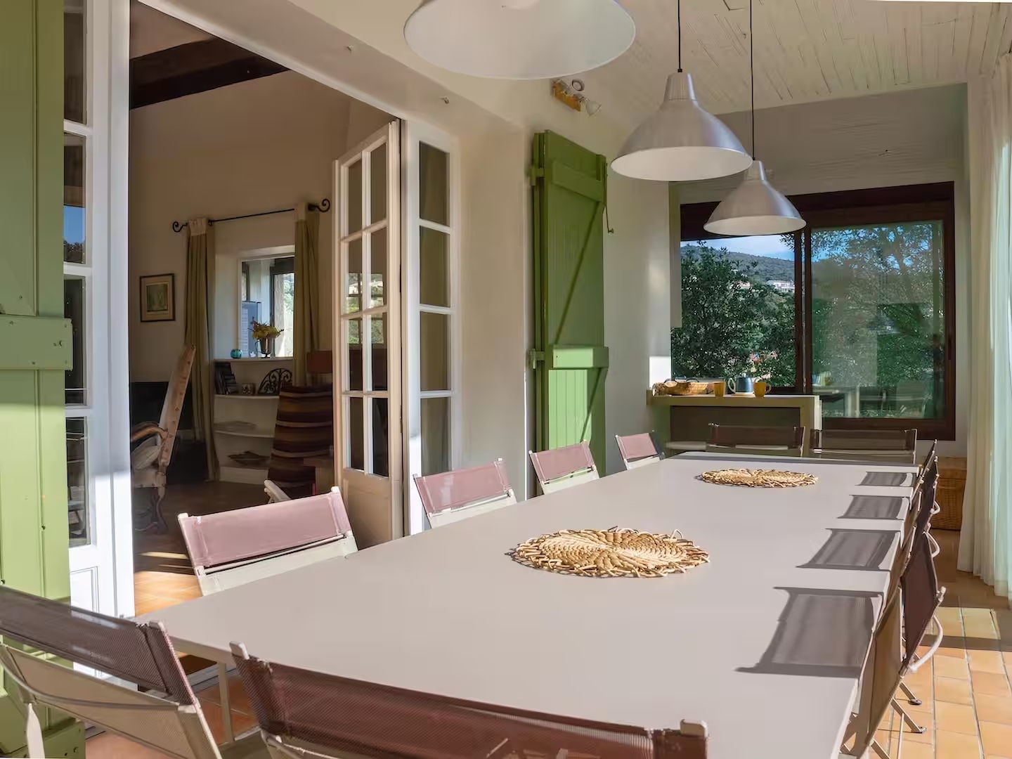 Salle à manger avec mobilier Fermob s’ouvrant sur la terrasse, donnant la sensation agréable d’être à la fois à l’intérieur et à l’extérieur.