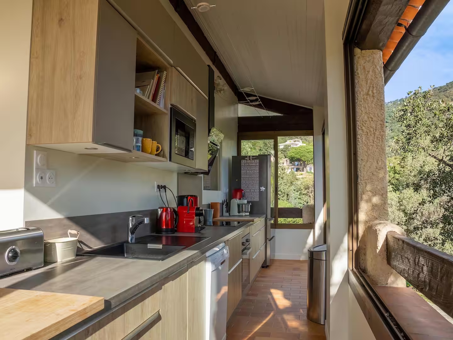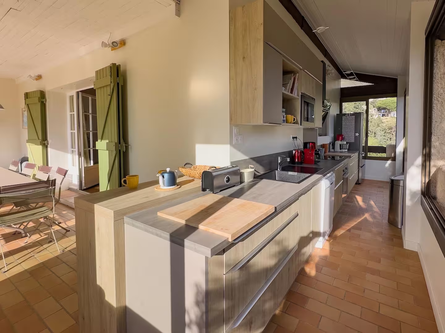 Cuisine moderne avec tout l’équipement : plaque à induction et four, réfrigérateur-congélateur grande capacité, lave-vaisselle, micro-ondes, machine à café à capsules et percolateur, grille-pain.