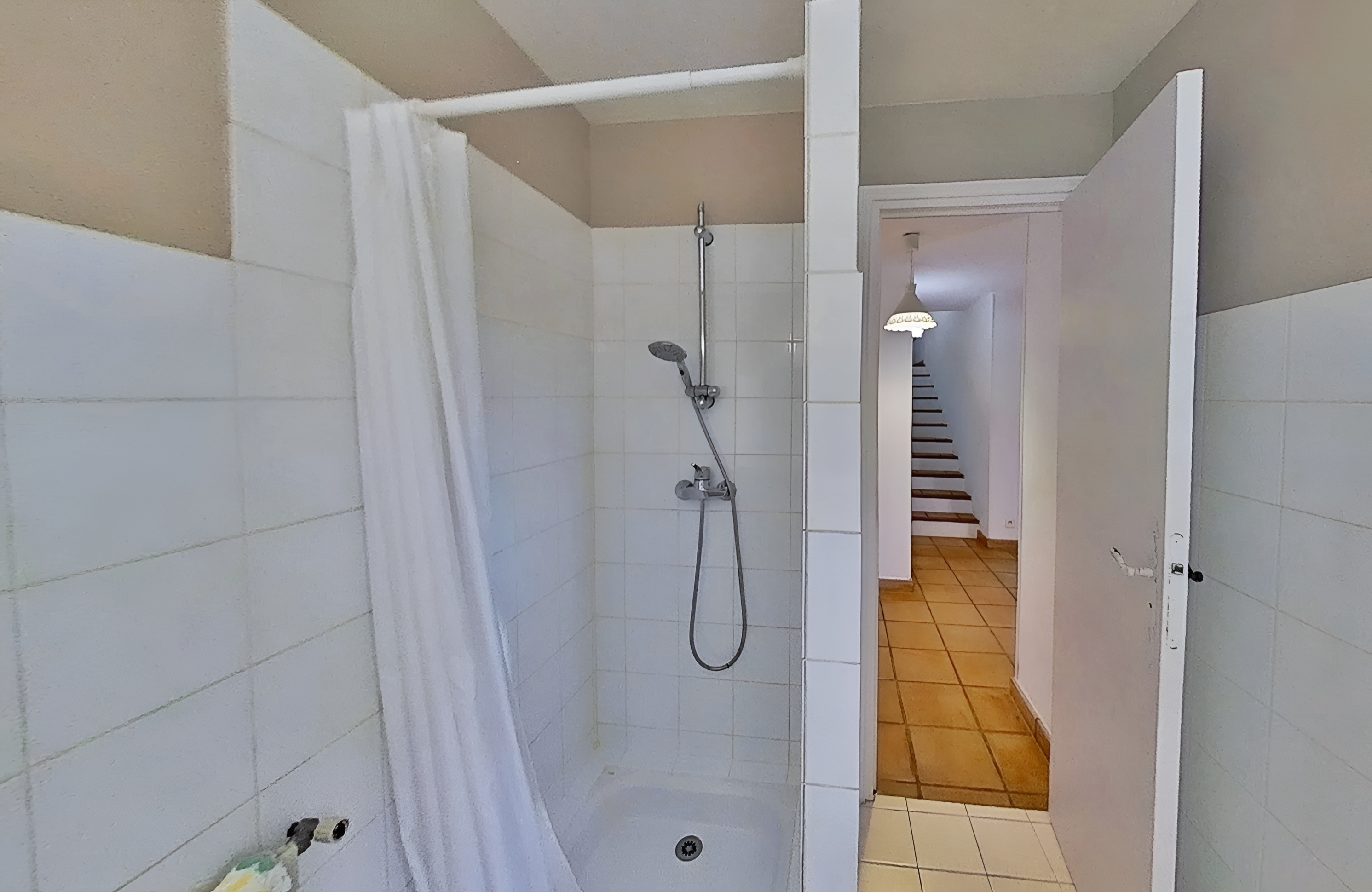 The villa’s layout features a ground floor bedroom with a comfortable double bed (160x200), a bathroom with both a bathtub and shower, a study, and a separate toilet. Downstairs, you'll find three additional bedrooms, two with double beds (140x200) and one with twin single beds (80x200), along with a second bathroom and another separate toilet.