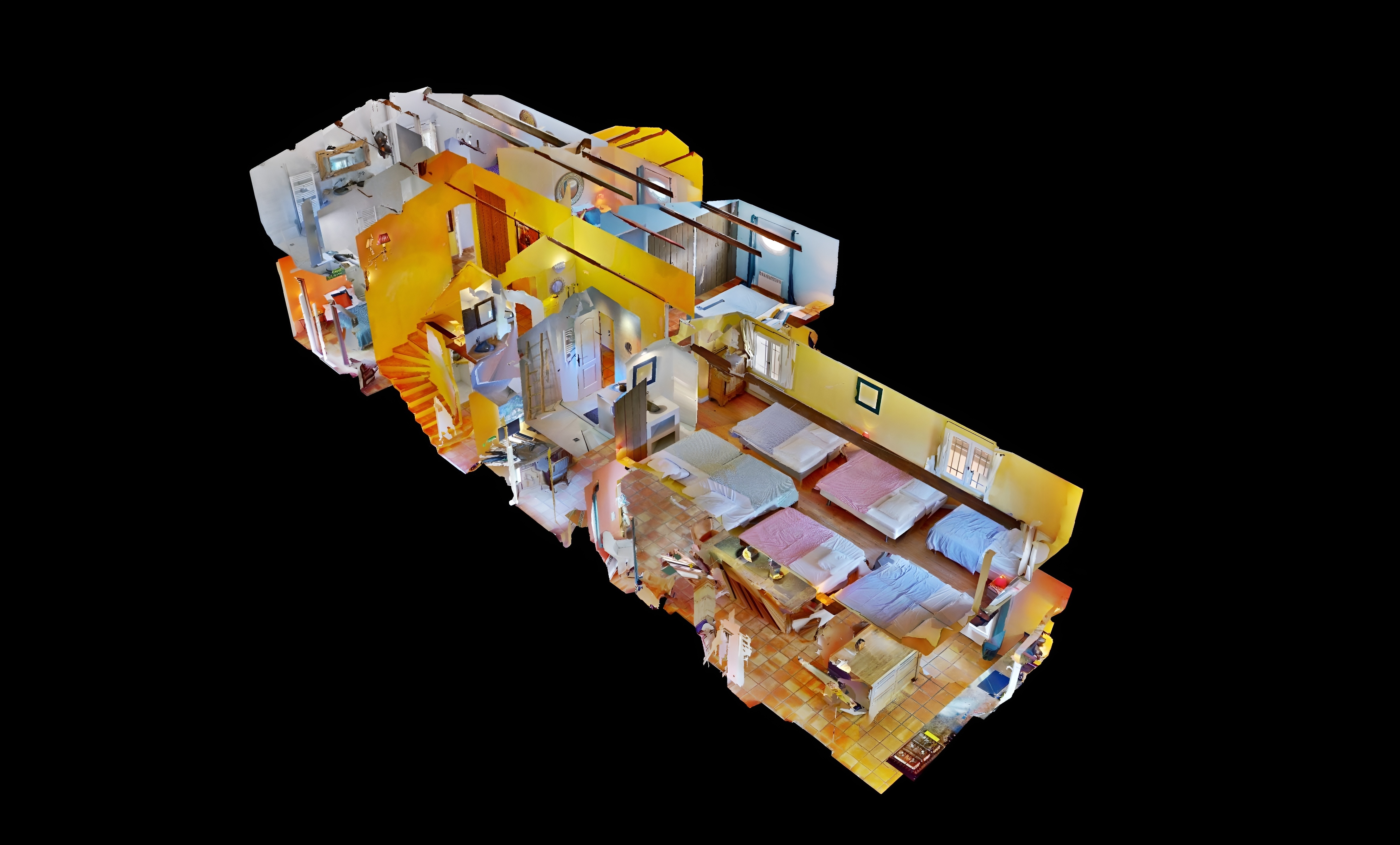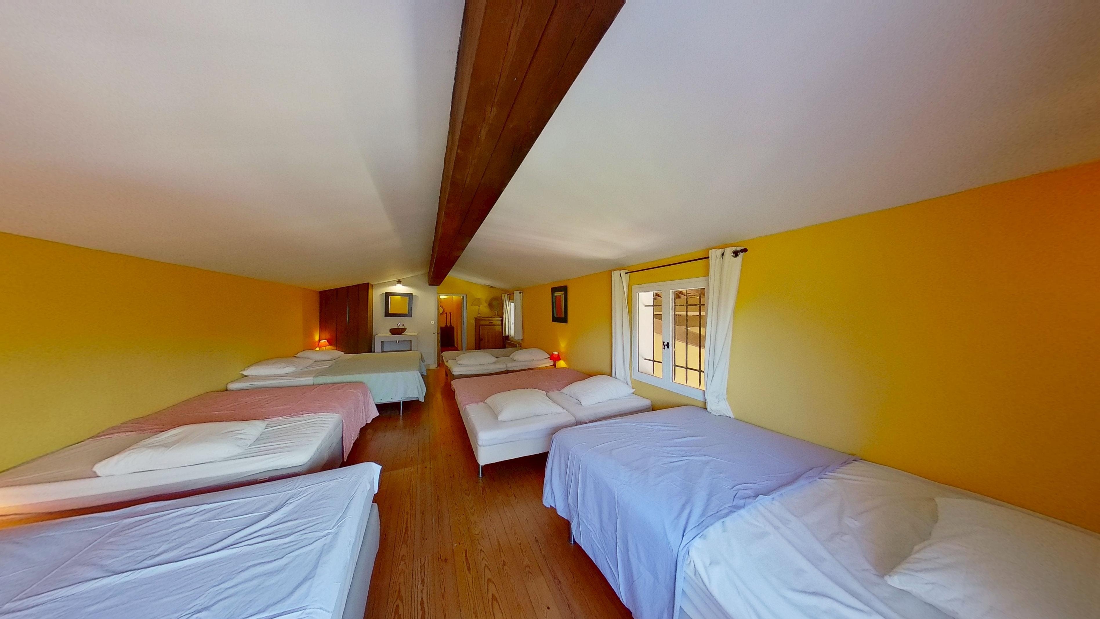 Upstairs, you’ll find four additional bedrooms: three feature 180x200 cm double beds, with one offering an ensuite bathroom complete with a shower, bathtub, double sink, and toilet. There is also a spacious family room furnished with four 140x200 cm beds and two 180x200 cm double beds. This floor includes two more bathrooms, each with a shower, sink, and a separate toilet.