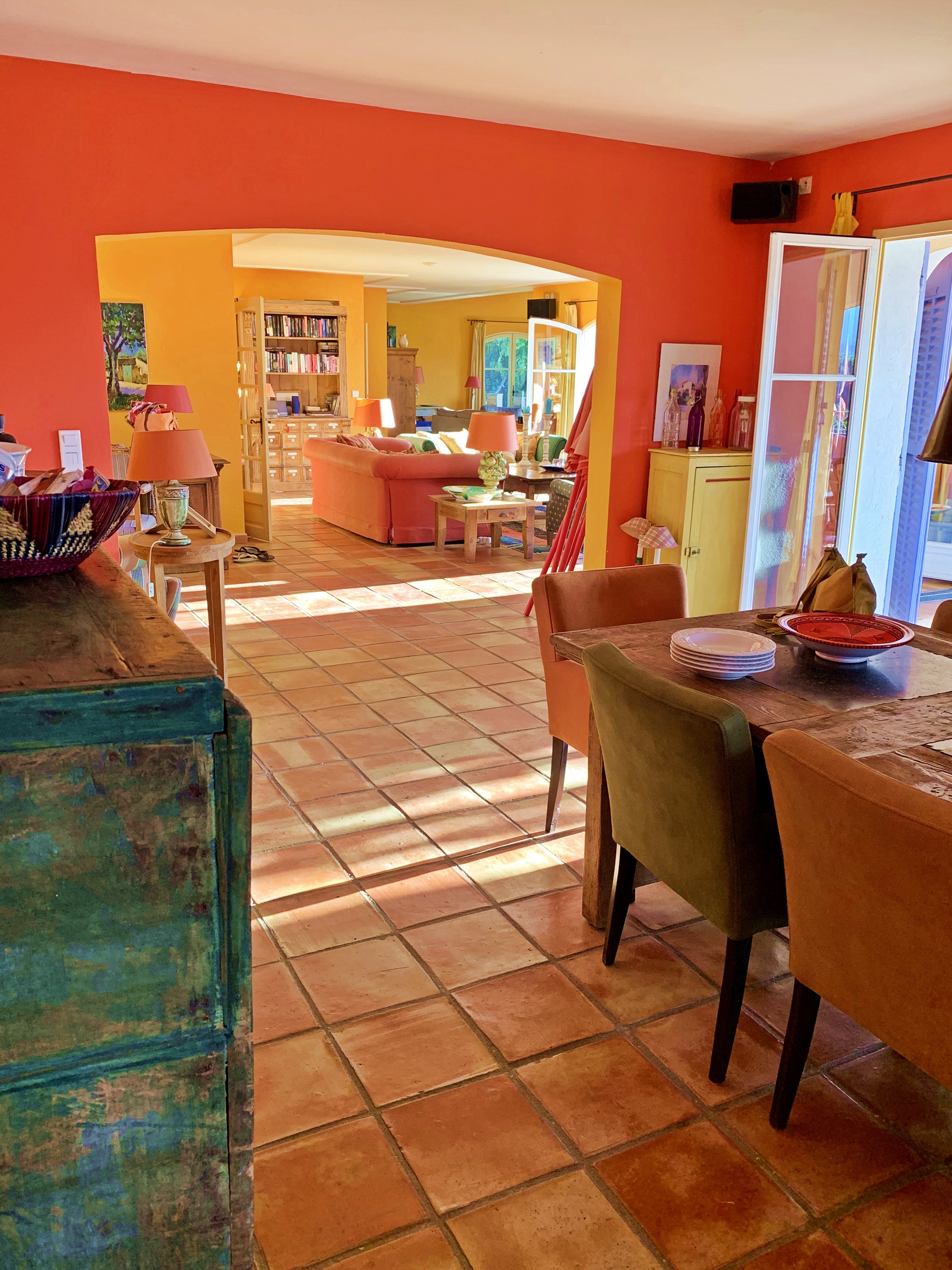 The centerpiece of the property is a private 12 x 6-meter swimming pool with a water alarm, perfect for cooling off on sunny afternoons. Multiple terraces catch the light throughout the day, giving you the choice of enjoying your morning coffee in the sun or raising a glass of wine as the sky turns golden at sunset. Inside, colorful décor and spacious living areas with fireplaces create a warm and welcoming atmosphere, ideal for families and friends looking to relax together in style.
