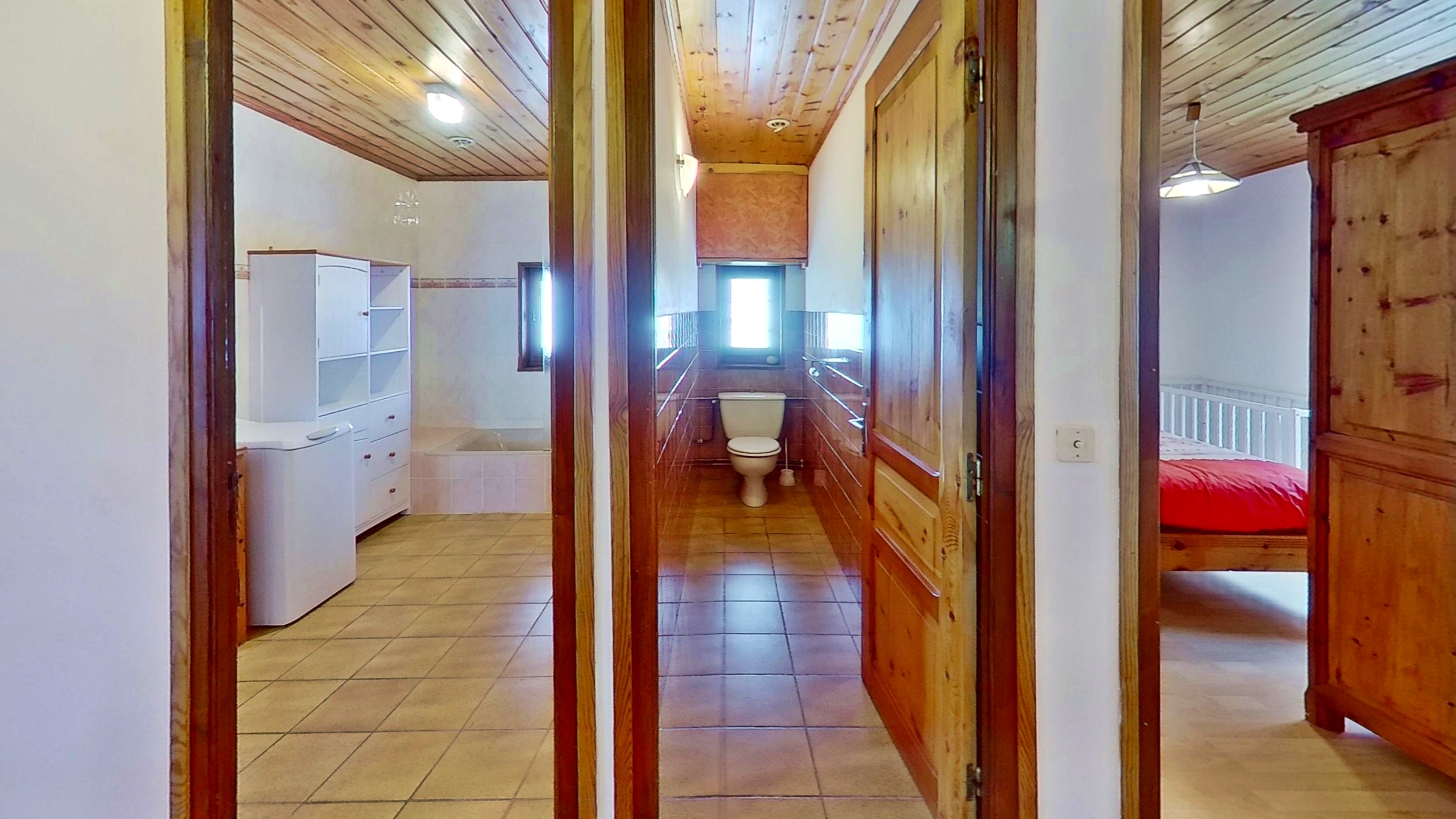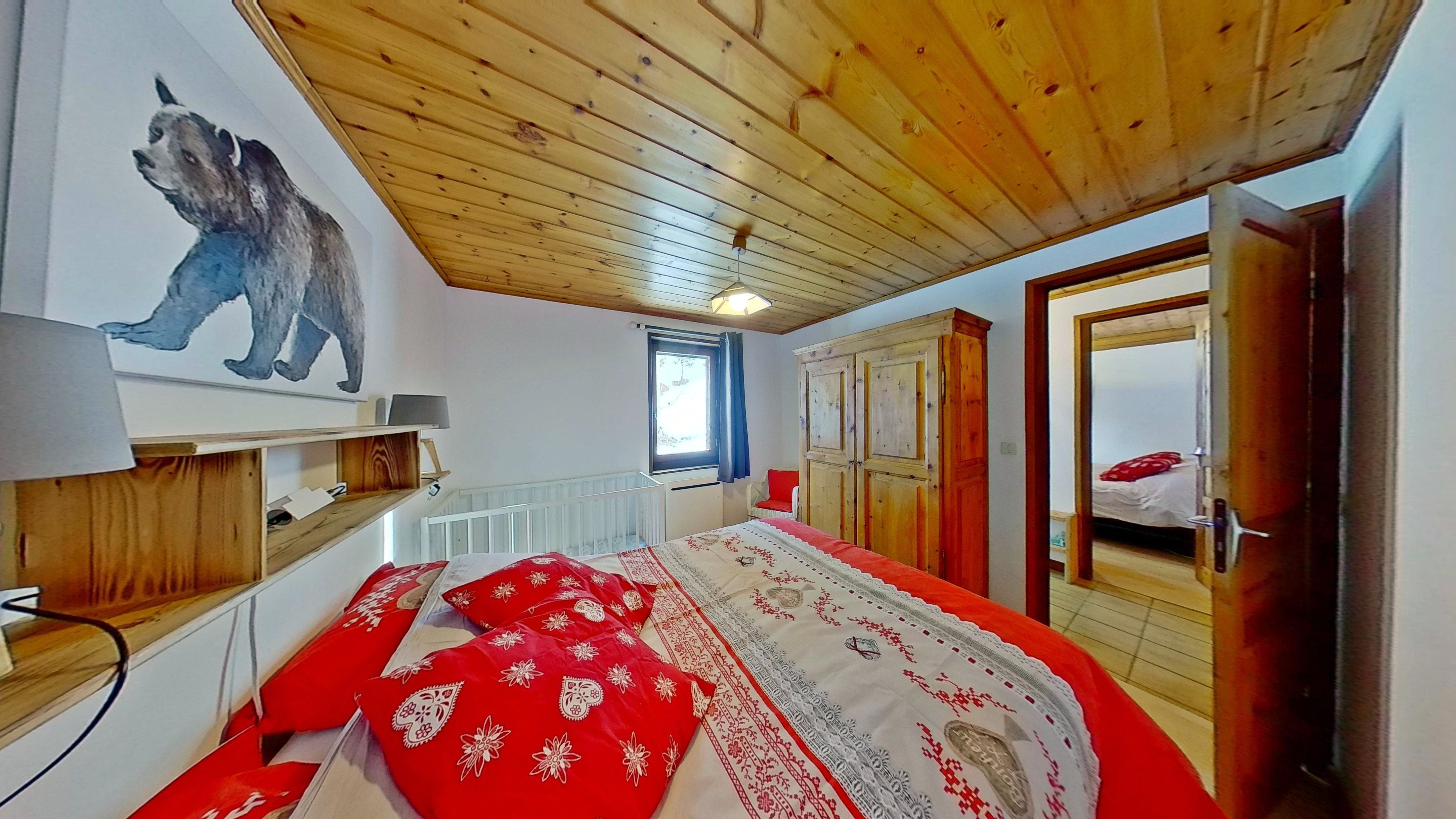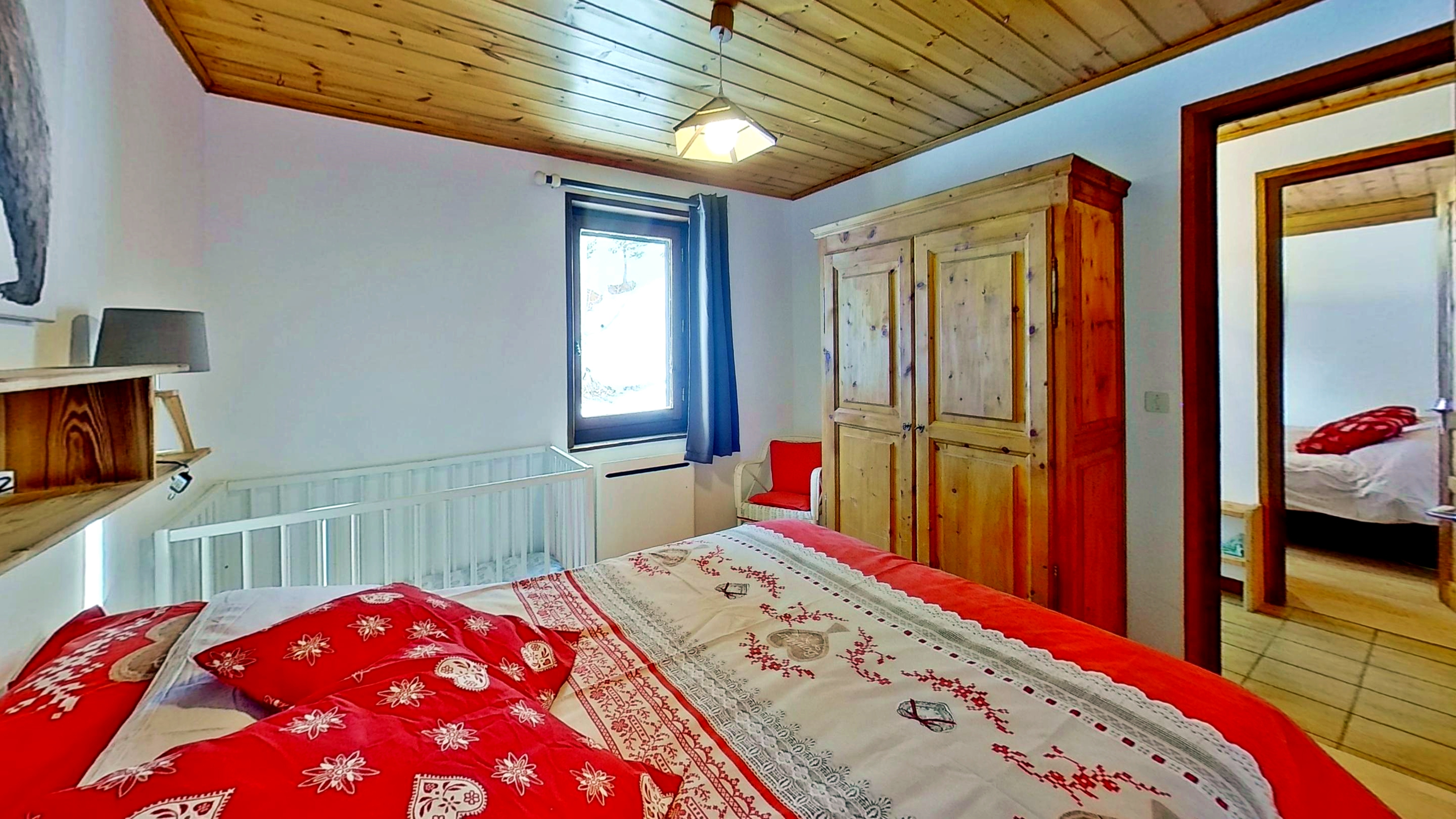 Inside, the apartment is both cozy and spacious, thoughtfully designed for your comfort. It features three warm and inviting bedrooms: a master suite with a luxurious double bed (160 x 200 cm), a second bedroom with a comfortable double bed (140 x 190 cm) and a crib, and a third bedroom with two single beds (90 x 200 cm), perfect for families or groups.