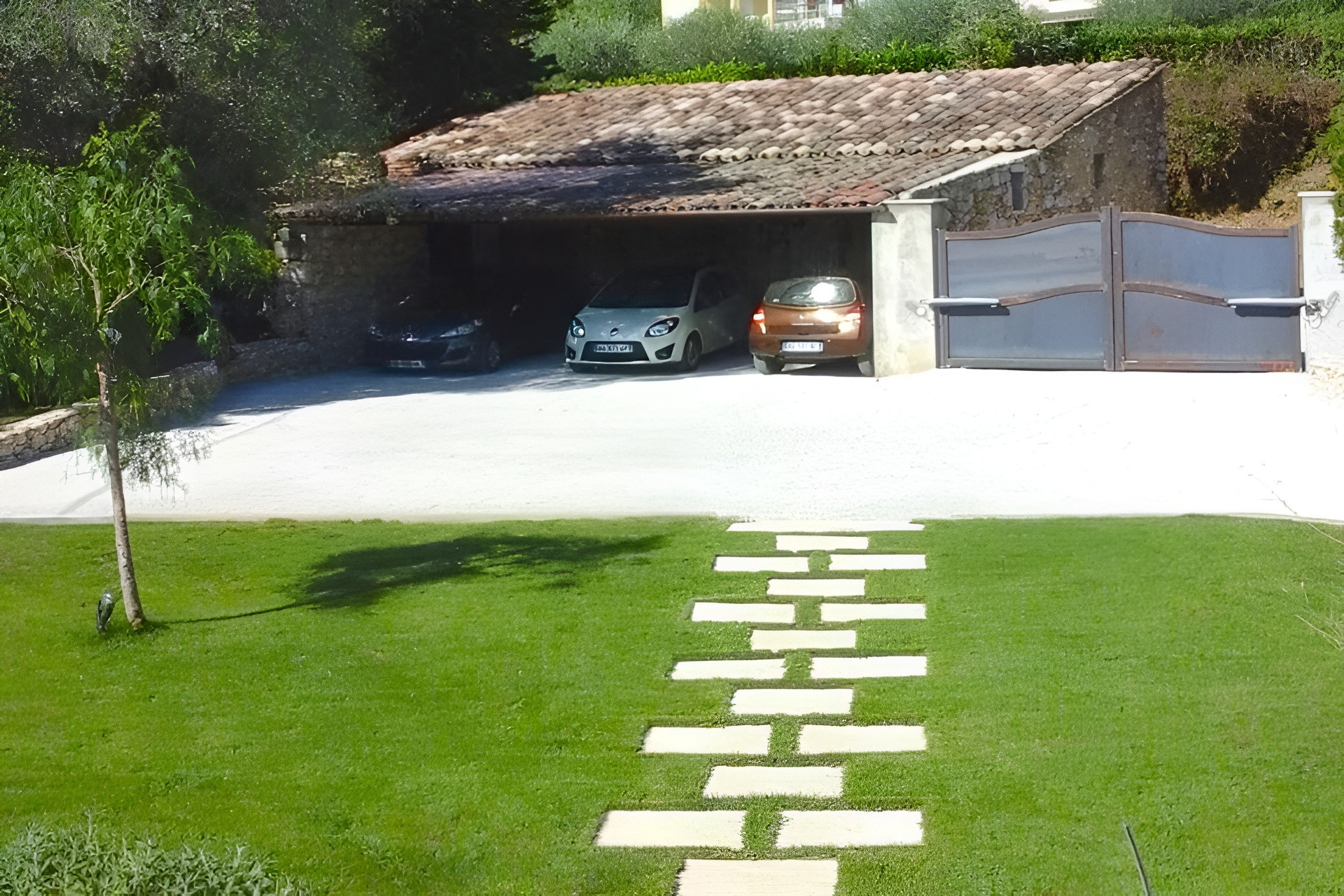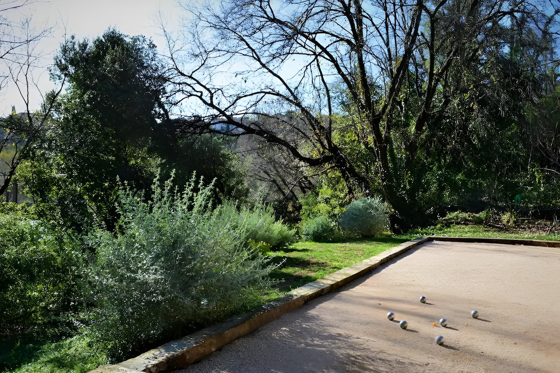 At the front, you'll find a large lawn, a pétanque court, and shaded parking that can accommodate up to three vehicles. An electric gate provides secure access to the property.