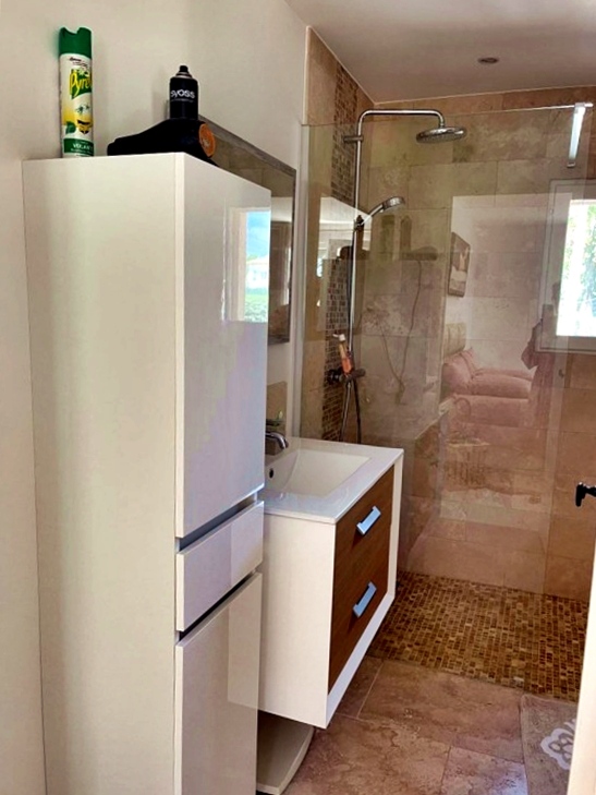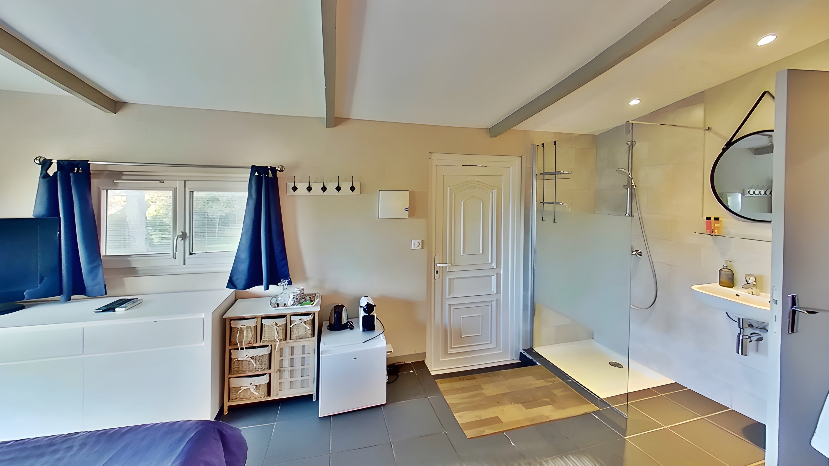 The villa also includes a private studio, featuring a double bed (140x190), en-suite bathroom, air-conditioning, a television, and coffee-making facilities, offering extra privacy for guests.